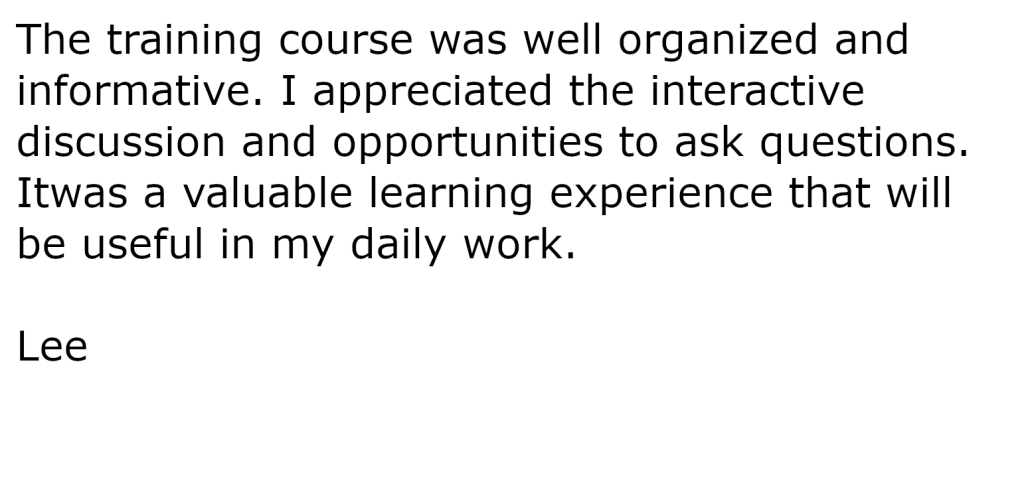 The completion of the course will be a written exam to assess the student’s understanding of the material, and the basic principles presented during the program. The exam will include multiple choice, true/false statements, and problem-solving questions.